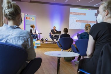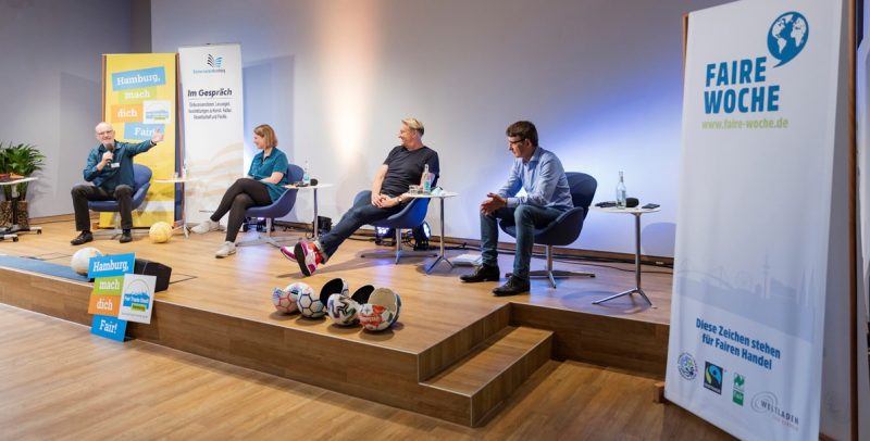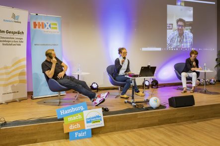 Am Nachmittag diskutierte Robert Weber mit Bernard Kössler (Hamburger Sportbund) und Lisa Marquardt („Leipzig spielt fair“/„Sport handelt Fair“) darüber, was sich in Hamburg für Umsetzungsmöglichkeiten bieten und wie fair gehandelte Bälle vermehrt in Umlauf gebracht werden können.