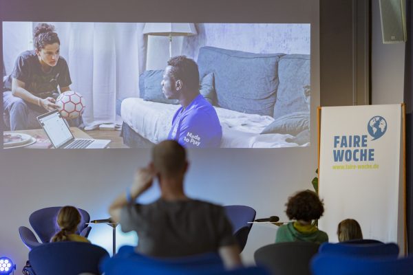In den Räumen der Zentralbibliothek gab es derweil ein spannendes Programm. Zweimal wurde die Doku-Fiktion #einBall gezeigt, die die sozial und ökologisch faire Herstellung von Fußbällen in den Mittelpunk stellt. Die Hauptpersonen sind drei junge Menschen – Amal, Ruben und Riaz –, die sich dafür einsetzen, dass Riaz‘ Onkel in Sialkot, Pakistan, sein Unternehmen auf faire Produktion umstellt. Dabei müssen sie nicht nur den Onkel überzeugen, sondern auch einige praktische Herausforderungen bewältigen.