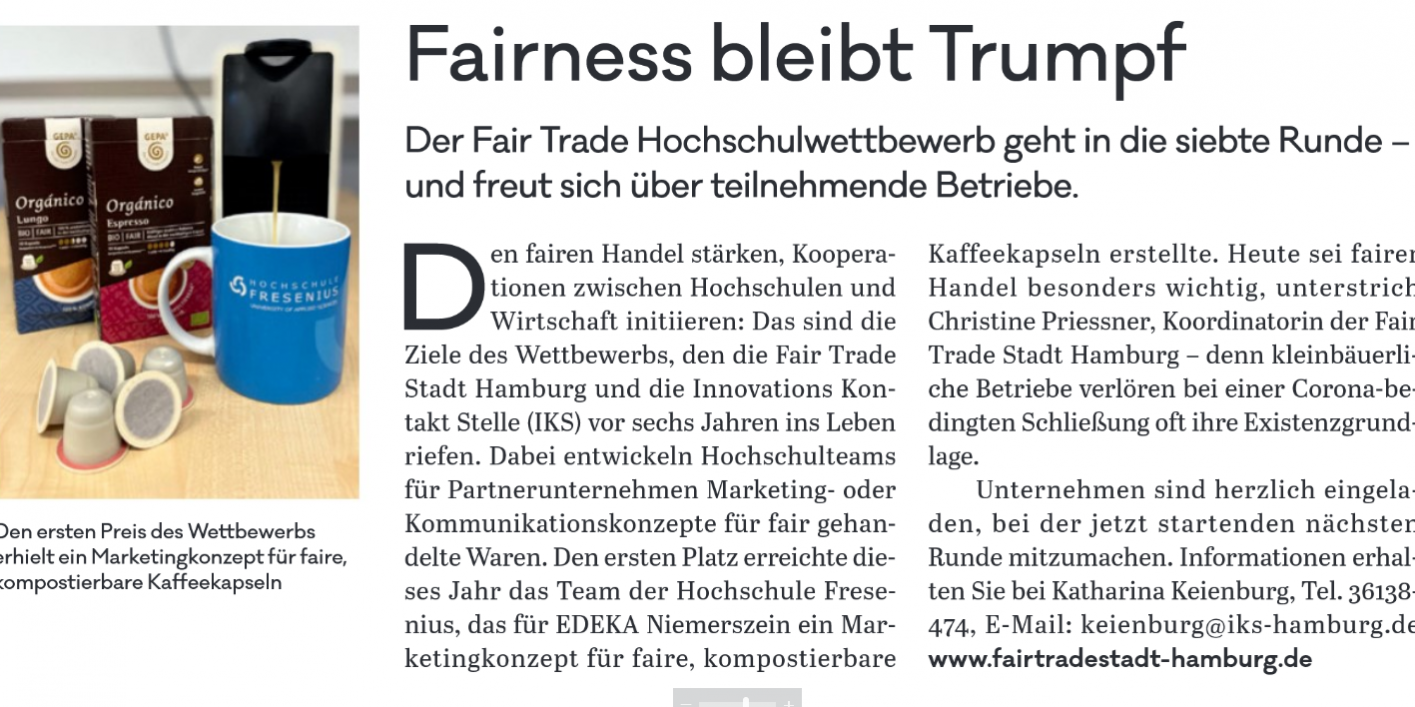 Den fairen Handel stärken, Kooperationen zwischen Hochschulen und Wirtschaft initiieren: Das sind die Ziele des Wettbewerbs, den die Fair Trade Stadt Hamburg und die Innovations Kontakt Stelle (IKS) vor sechs Jahren ins Leben riefen. Dabei entwickeln Hochschulteams für Partnerunternehmen Marketing- oder Kommunikationskonzepte für fair gehandelte Waren. Den ersten Platz erreichte dieses Jahr das Team der Hochschule Fresenius, das für EDEKA Niemerszein ein Marketingkonzept für faire, kompostierbare Kaffeekapseln erstellte. Heute sei fairer Handel besonders wichtig, unterstrich Christine Priessner, Koordinatorin der Fair Trade Stadt Hamburg – denn kleinbäuerliche Betriebe verlören bei einer Corona-bedingten Schließung oft ihre Existenzgrundlage.