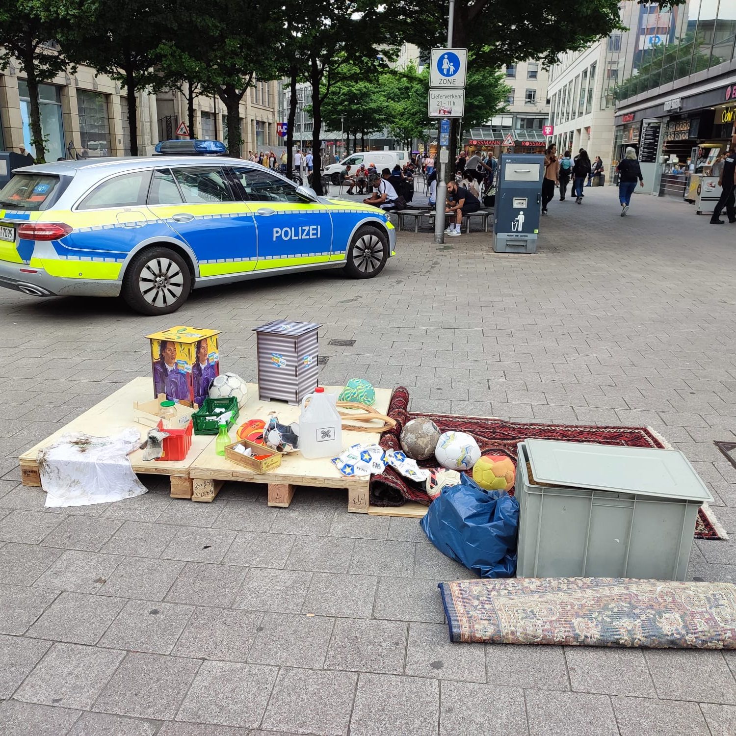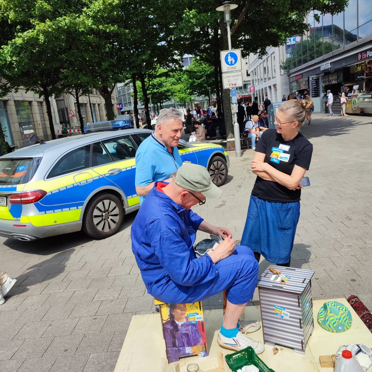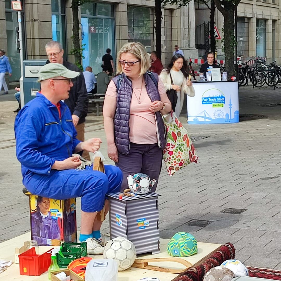 Nur wenige Passant:innen waren bereit, tatsächlich in der fiktiven Ballfabrik am vorbereiteten Arbeitsplatz Platz zu nehmen und mit der Nadel die Panelen des Balls zusammen zu nähen. Dies ist zum Teil der Platzierung in der Mönckebergstraße geschuldet, wo viele Menschen zum Bahnhof eilten oder schnelle Erledigungen planten. Trotzdem ergaben sich fruchtbare Gespräche mit vielen Menschen, die neugierig und interessiert auf unserer Aktion reagierten.
