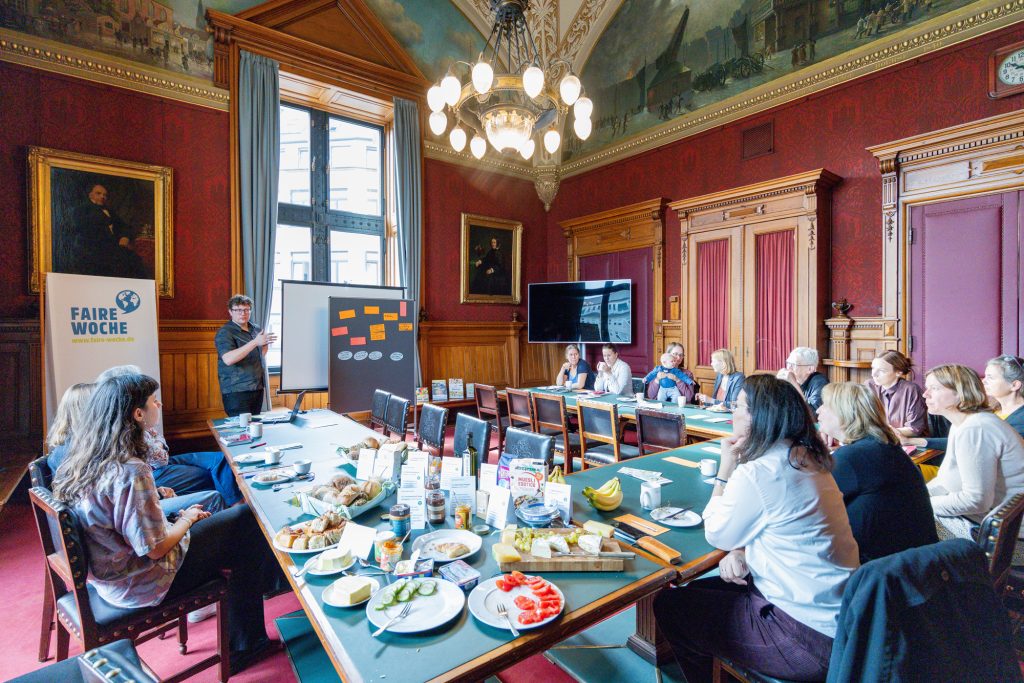 Am 11.09.2025 fand zum Auftakt der Fairen Woche 2025 in Kooperation mit dem Ernährungsrat Hamburg e.V. unser Faires Frühstück im Hamburger Rathaus statt. Unter dem Motto „Vielfalt schmecken“, haben wir bei einem leckeren Frühstück mit Fairtrade-Produkten anlässlich der erneuten Auszeichnung Hamburgs zur Fairtrade-Stadt gemeinsam mit Abgeordneten der Hamburger Bürgerschaft überlegt, wie der Faire Handel in Hamburg in Zukunft noch besser gestärkt werden kann, insbesondere in Bezug auf Ernährung und Lebensmittel und als Instrument zur Erreichung der SDGs.